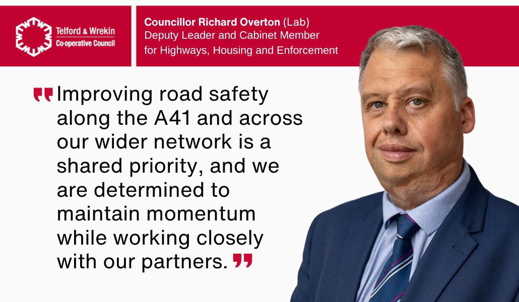 Councillor Richard Overton, Deputy Leader and Cabinet Member for Highways, Housing and Enforcement at Telford & Wrekin Council, said: “Improving road safety along the A41 and across our wider network is a shared priority, and we are determined to maintain momentum while working closely with our partners.